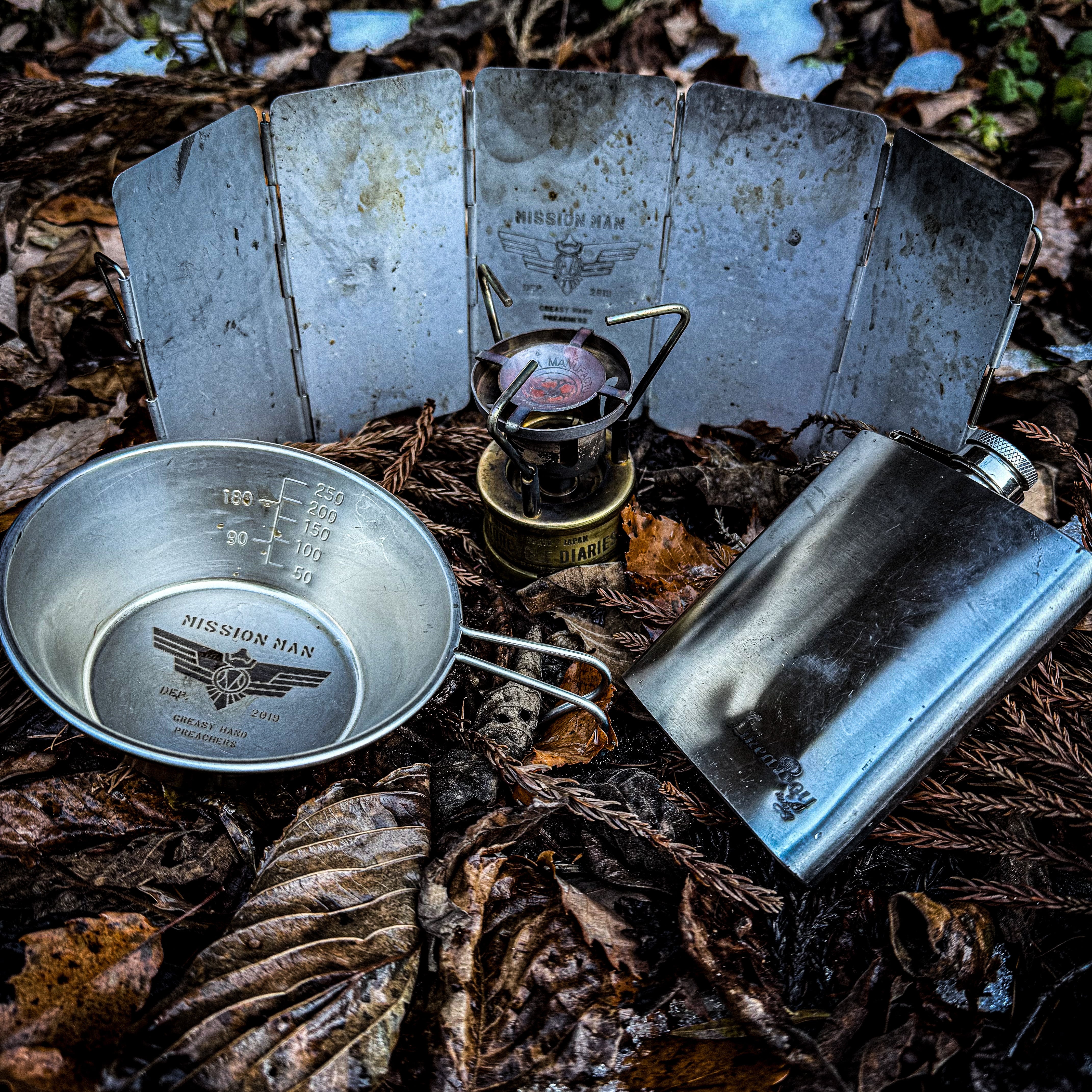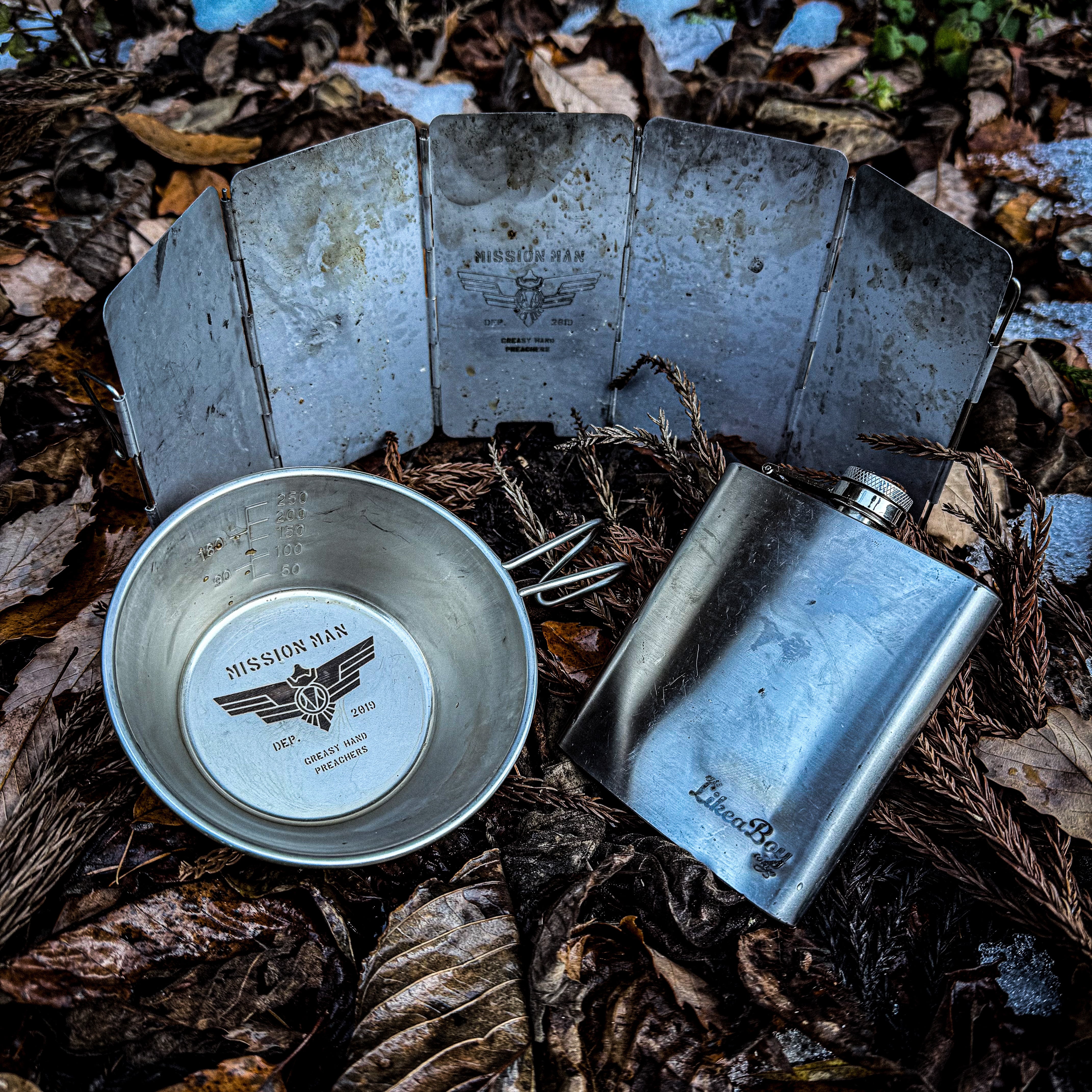 男なら一度は憧れるスキットル。野営で映えるシェラカップ。実用性が非常に高いウィンドシールド。