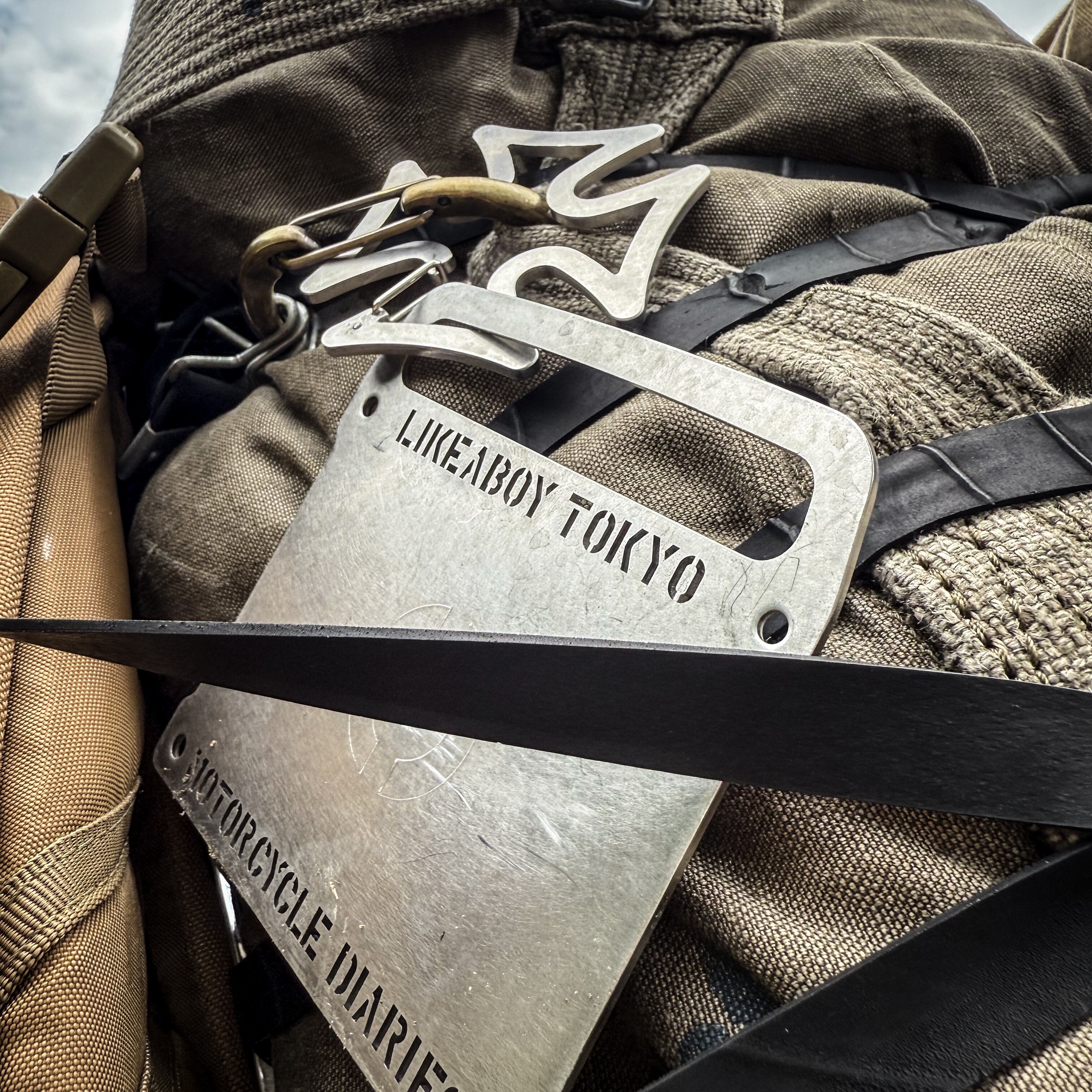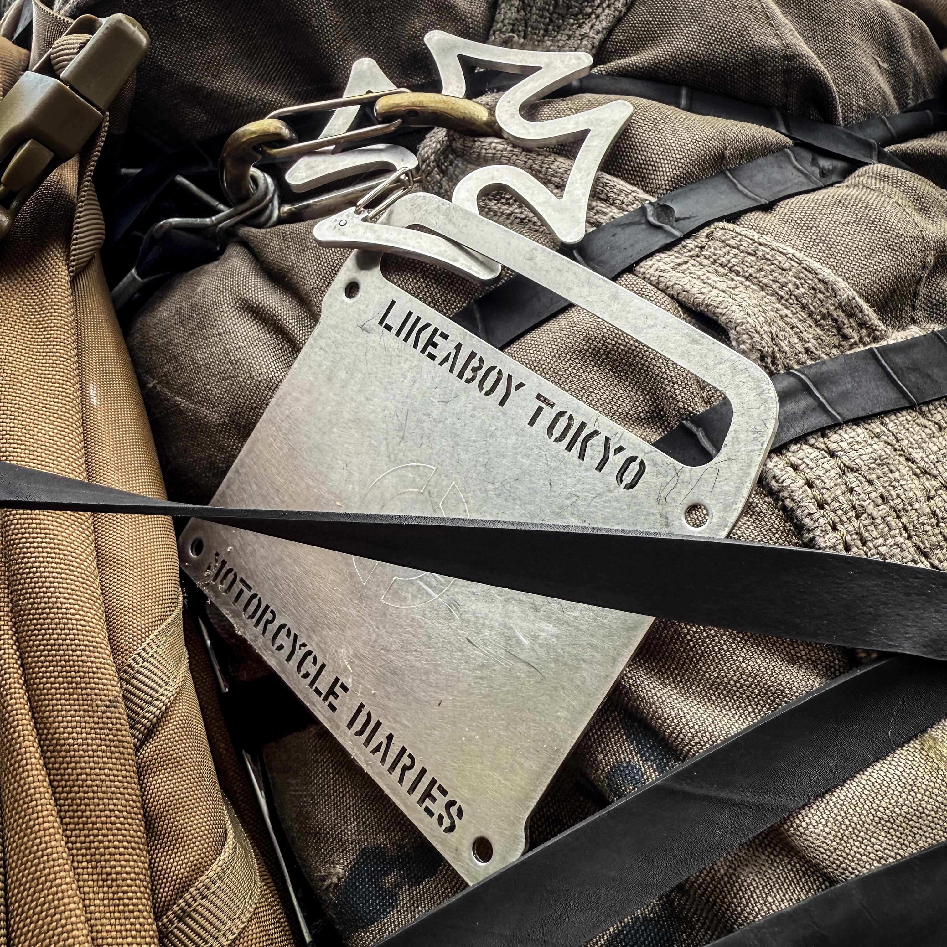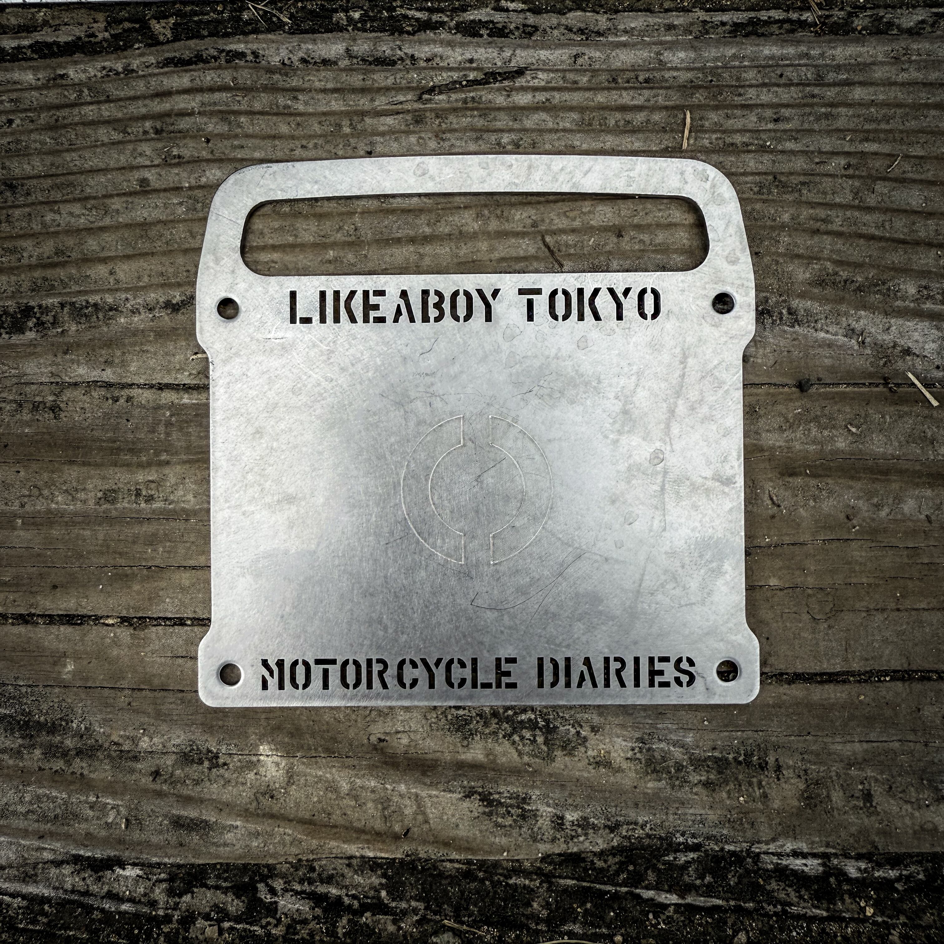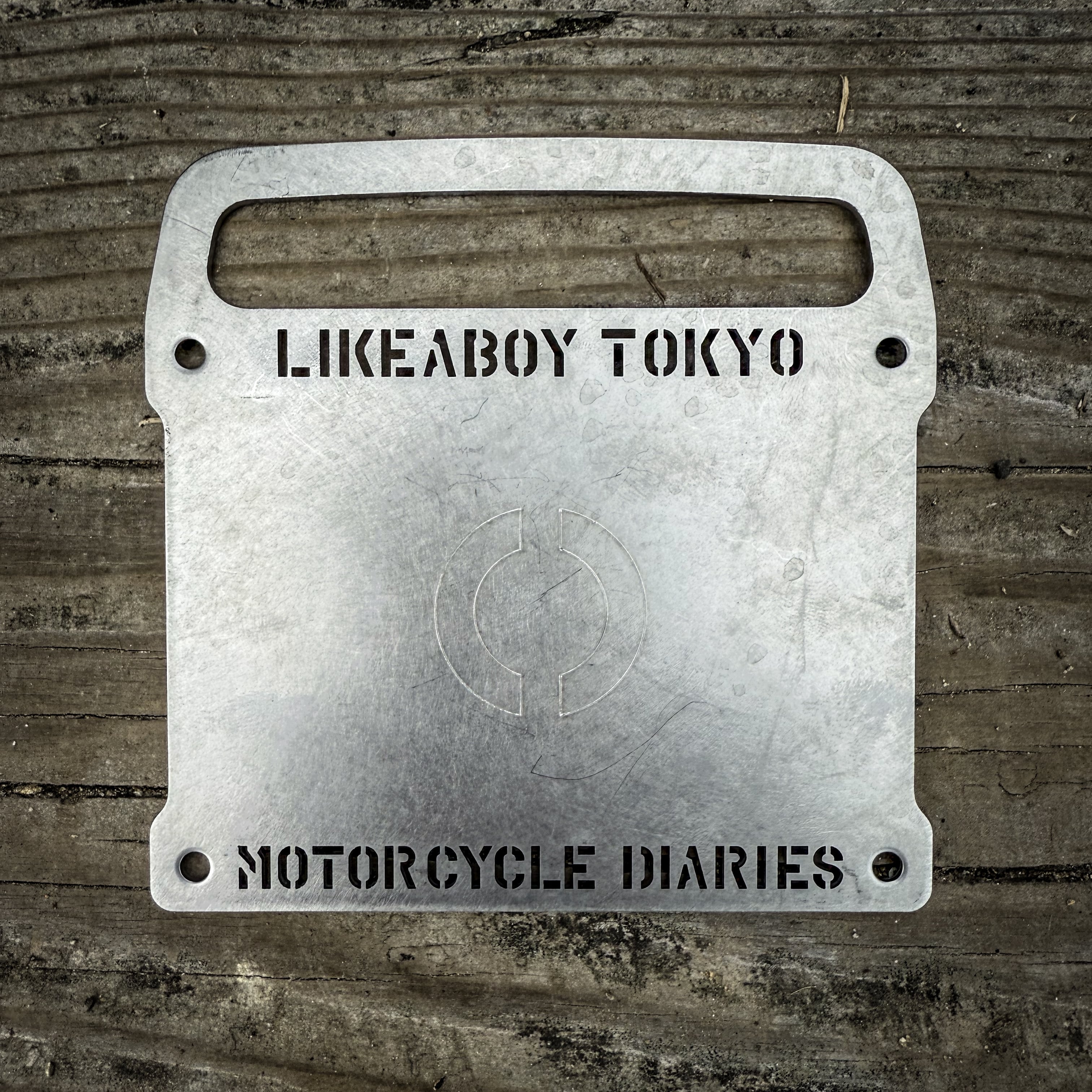 LIKEABOY、MOTORCYCLE DIARIESのロゴ、そして真ん中にオーシマデザインさんのロゴを刻印したデザイン。