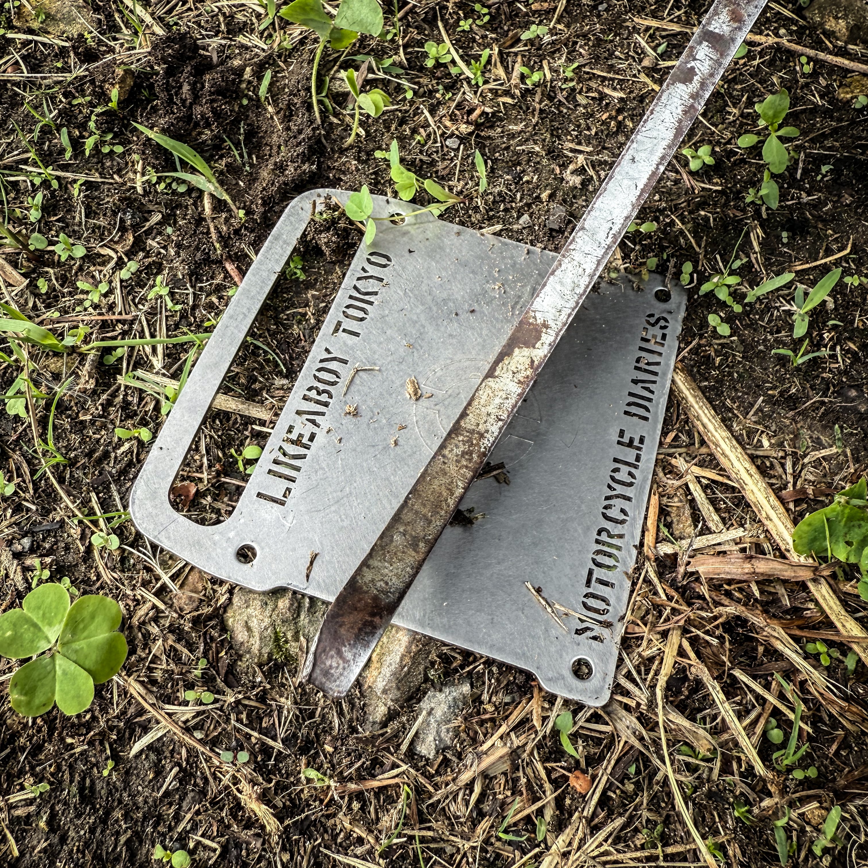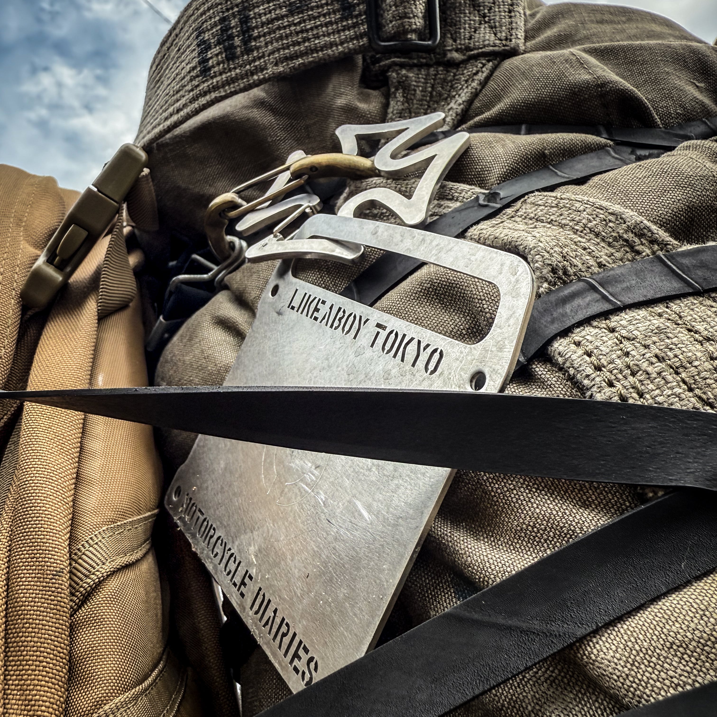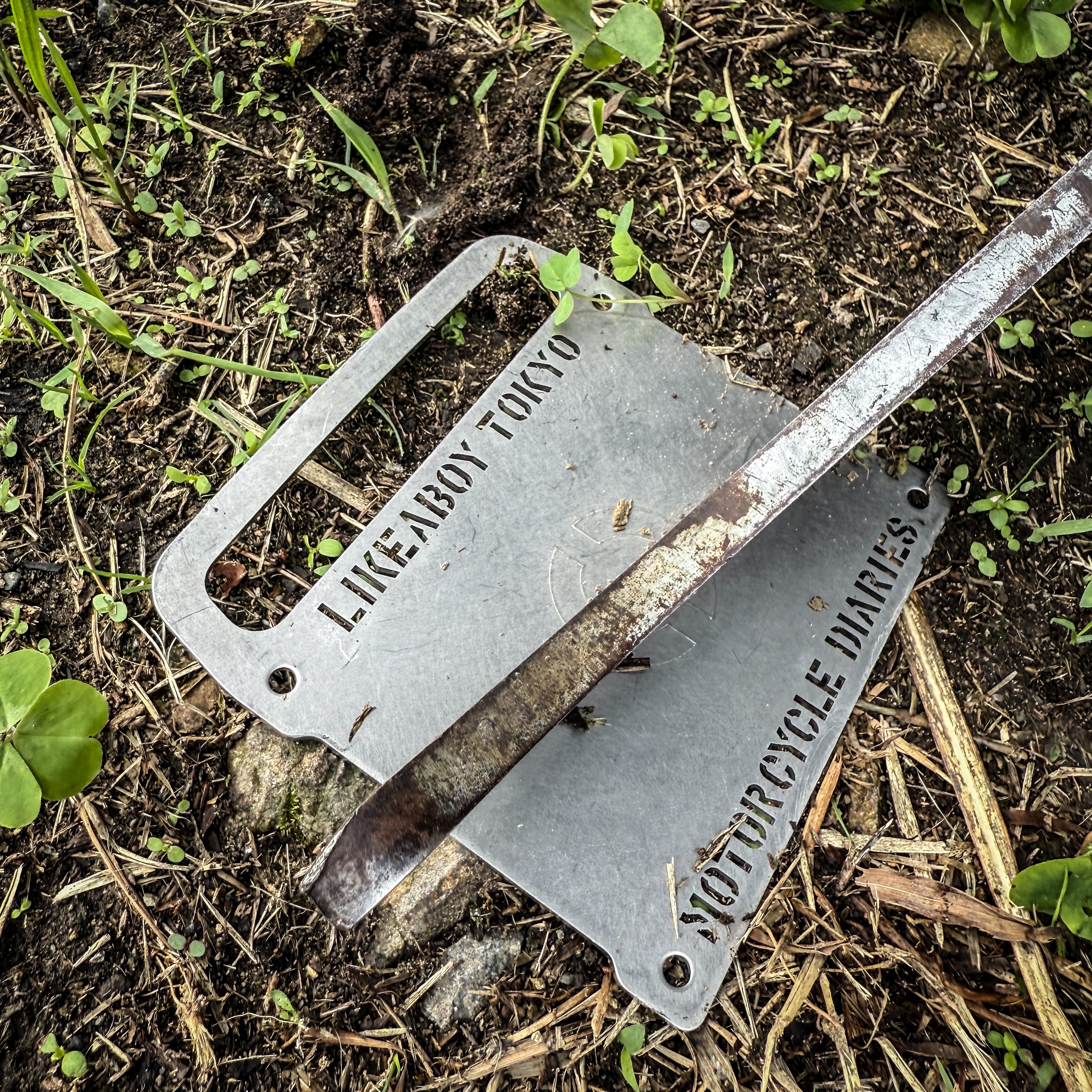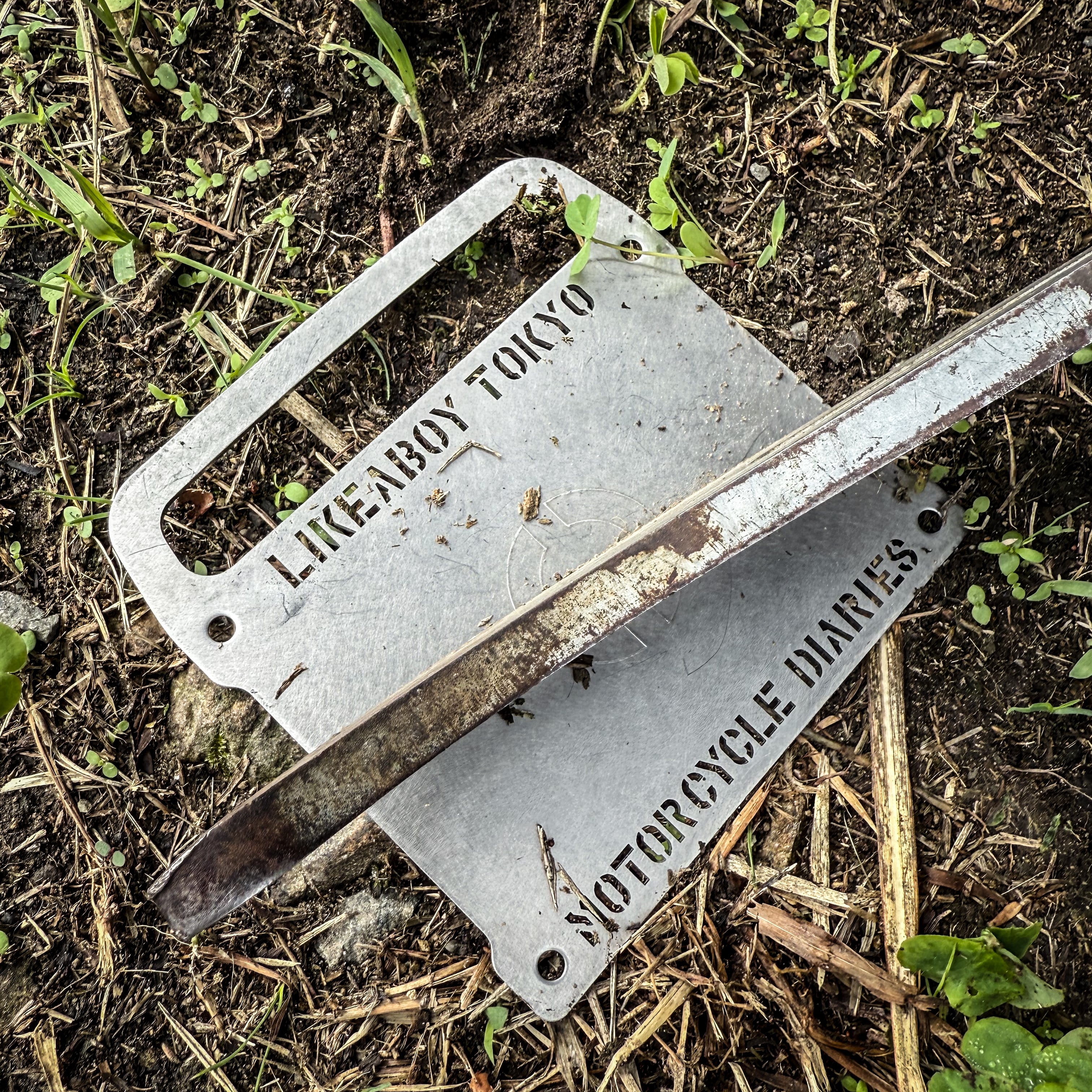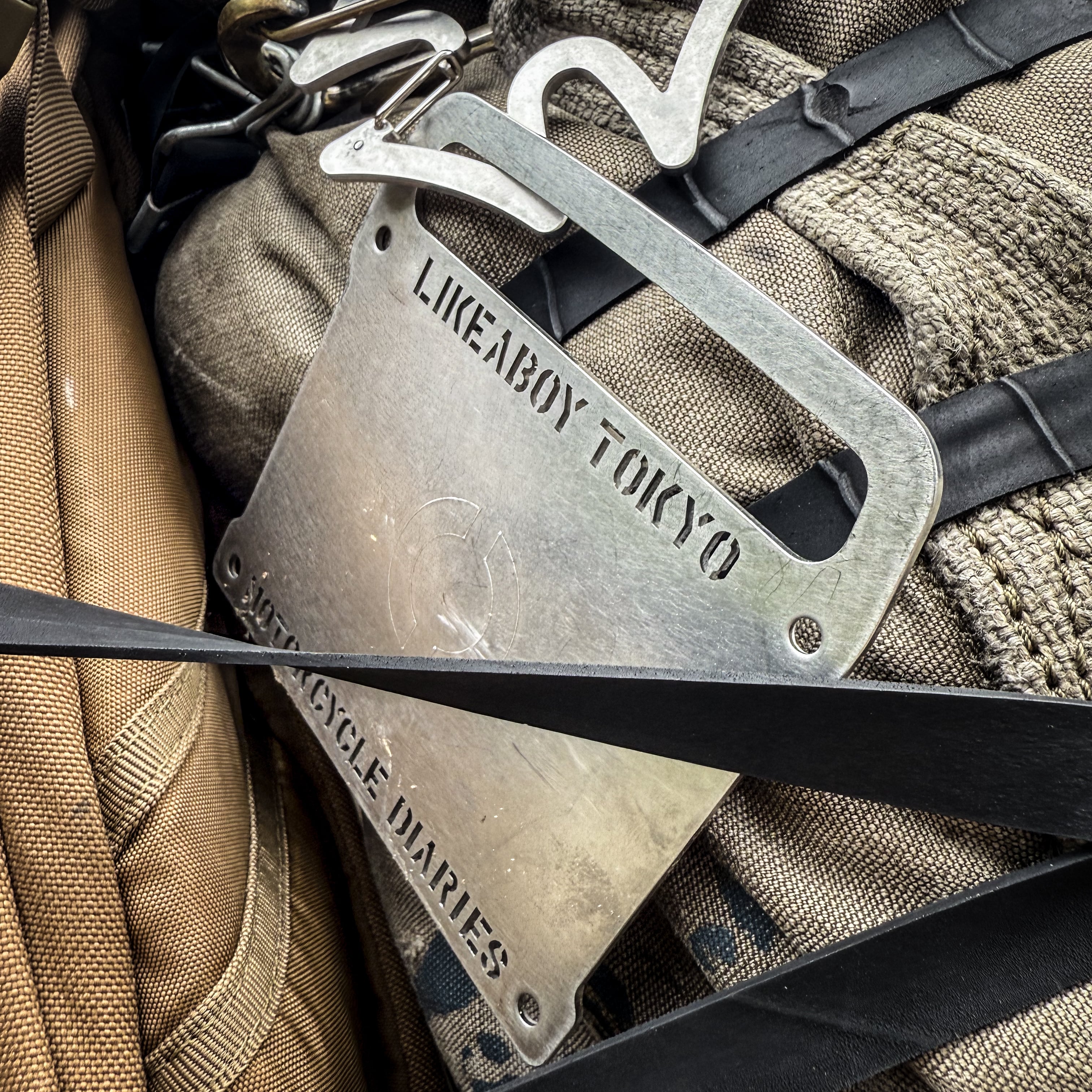 LIKEABOY、MOTORCYCLE DIARIESのロゴ、そして真ん中にオーシマデザインさんのロゴを刻印したデザイン。