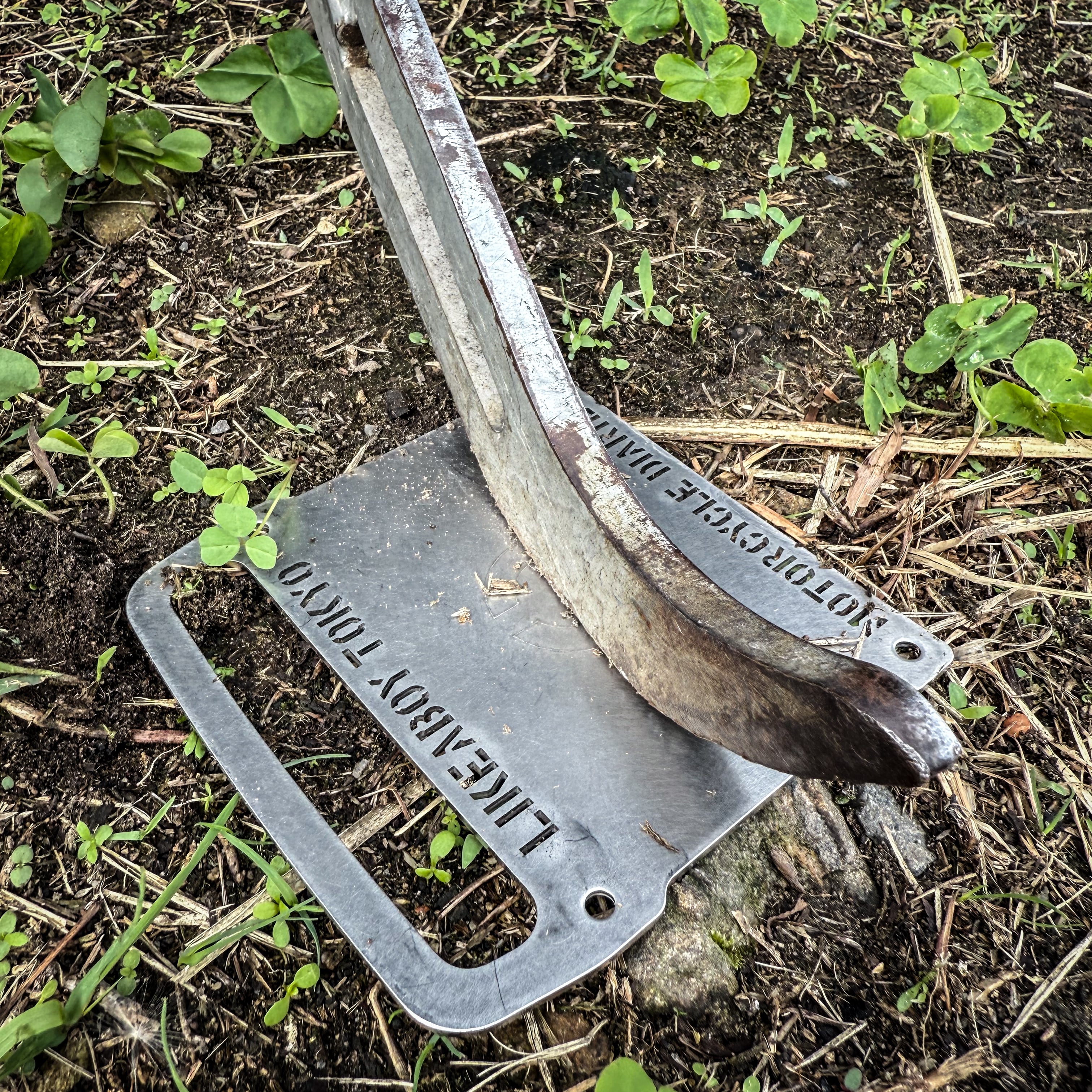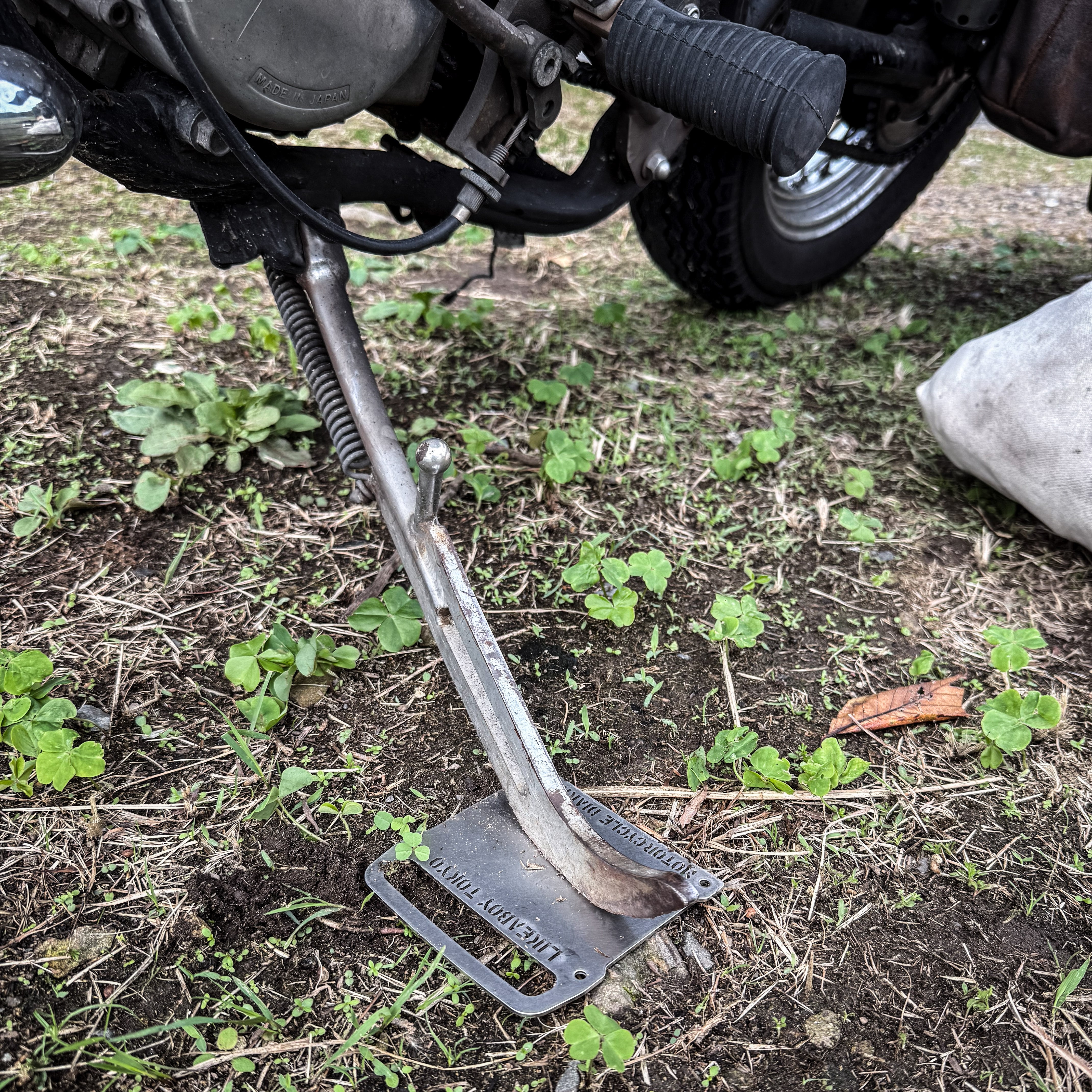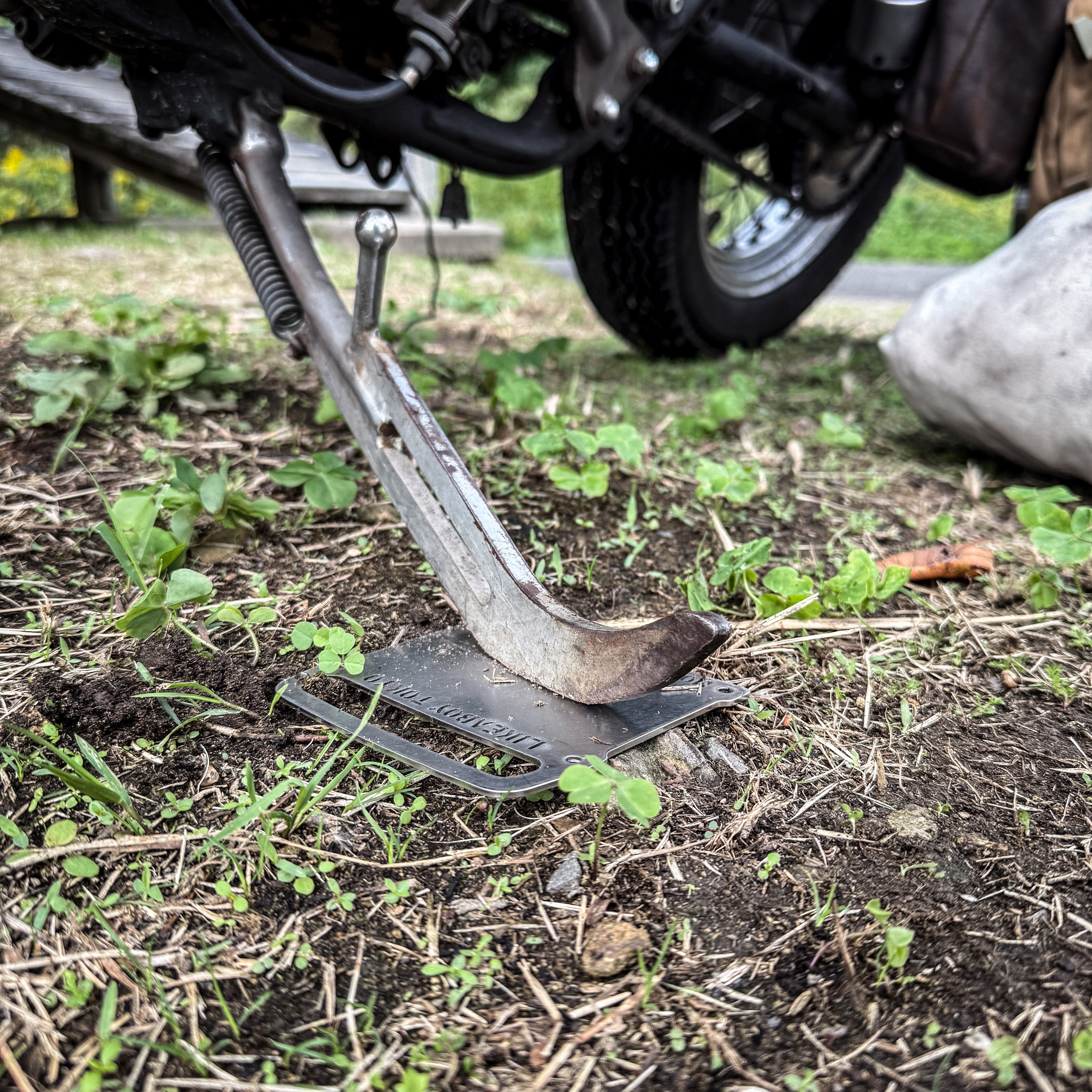 足場の悪い林道、砂利道、キャンプ場などで大活躍のサイドスタンドプレート!