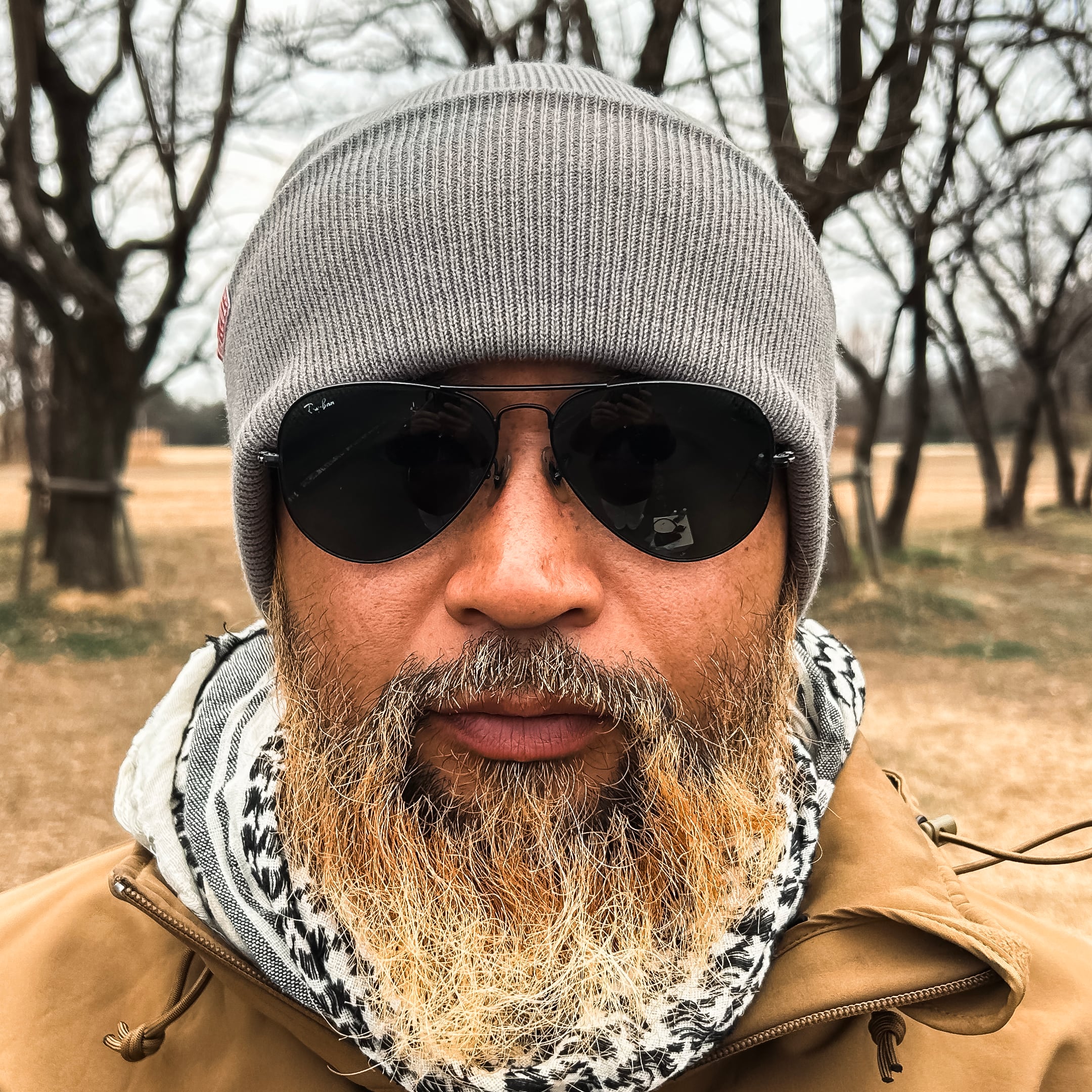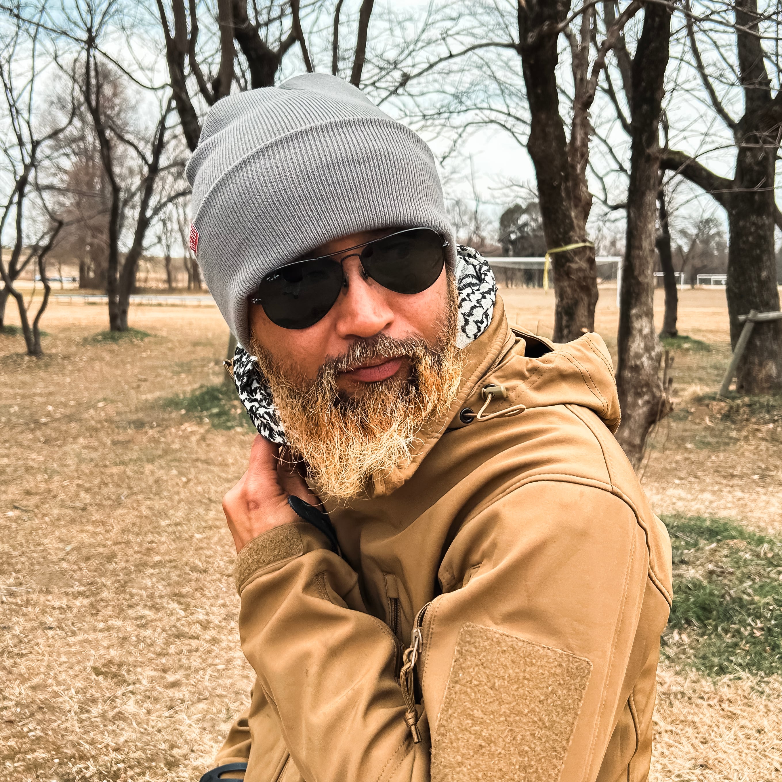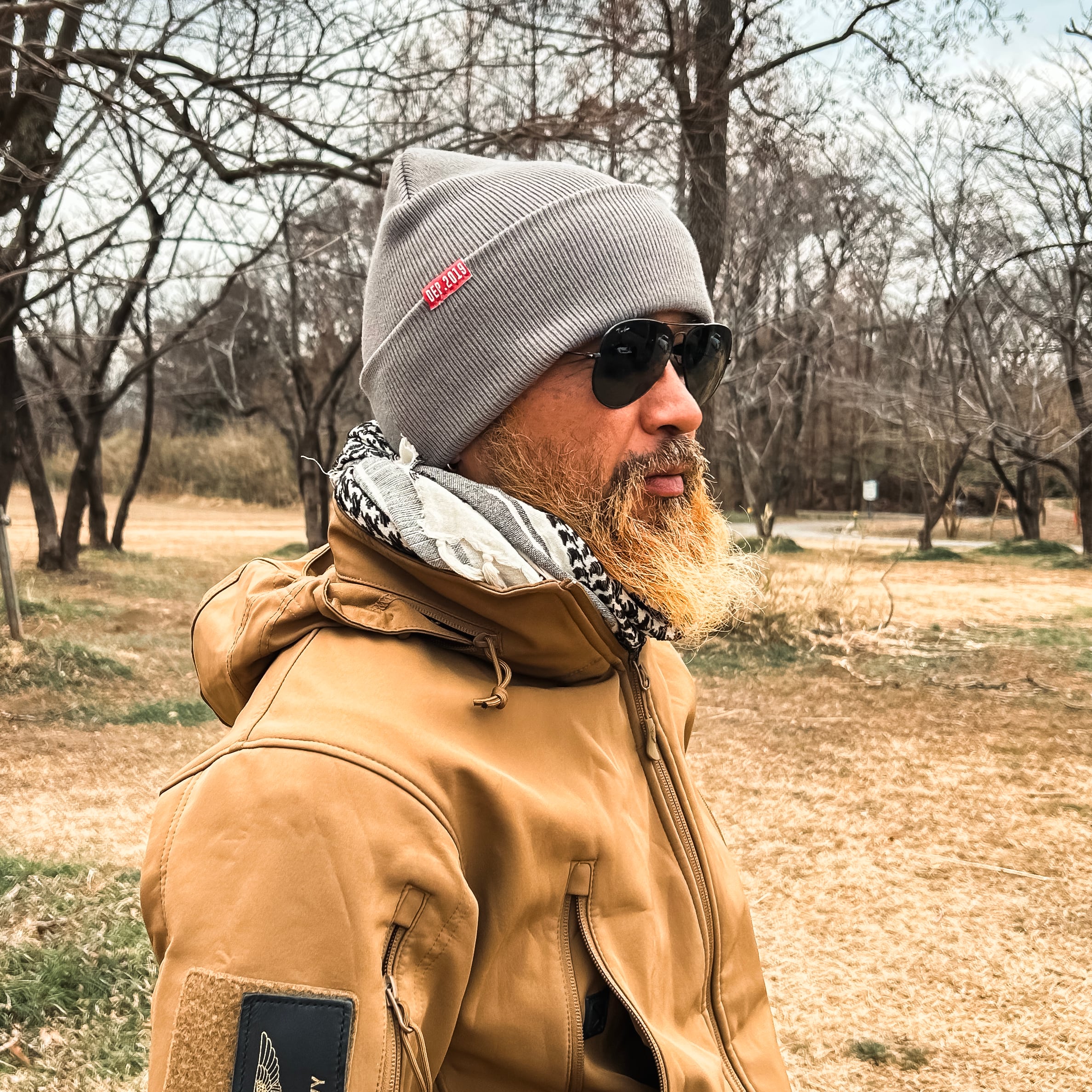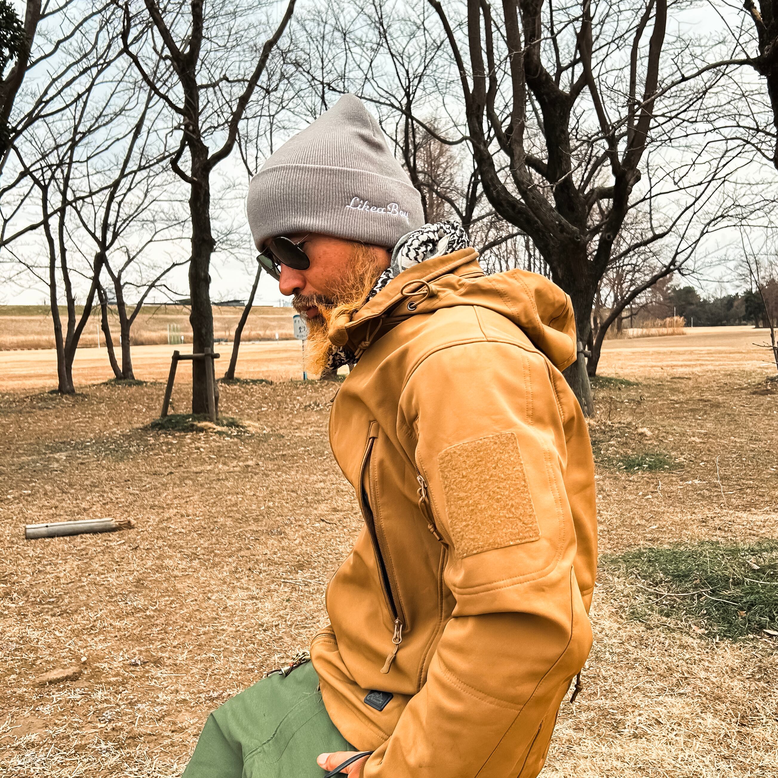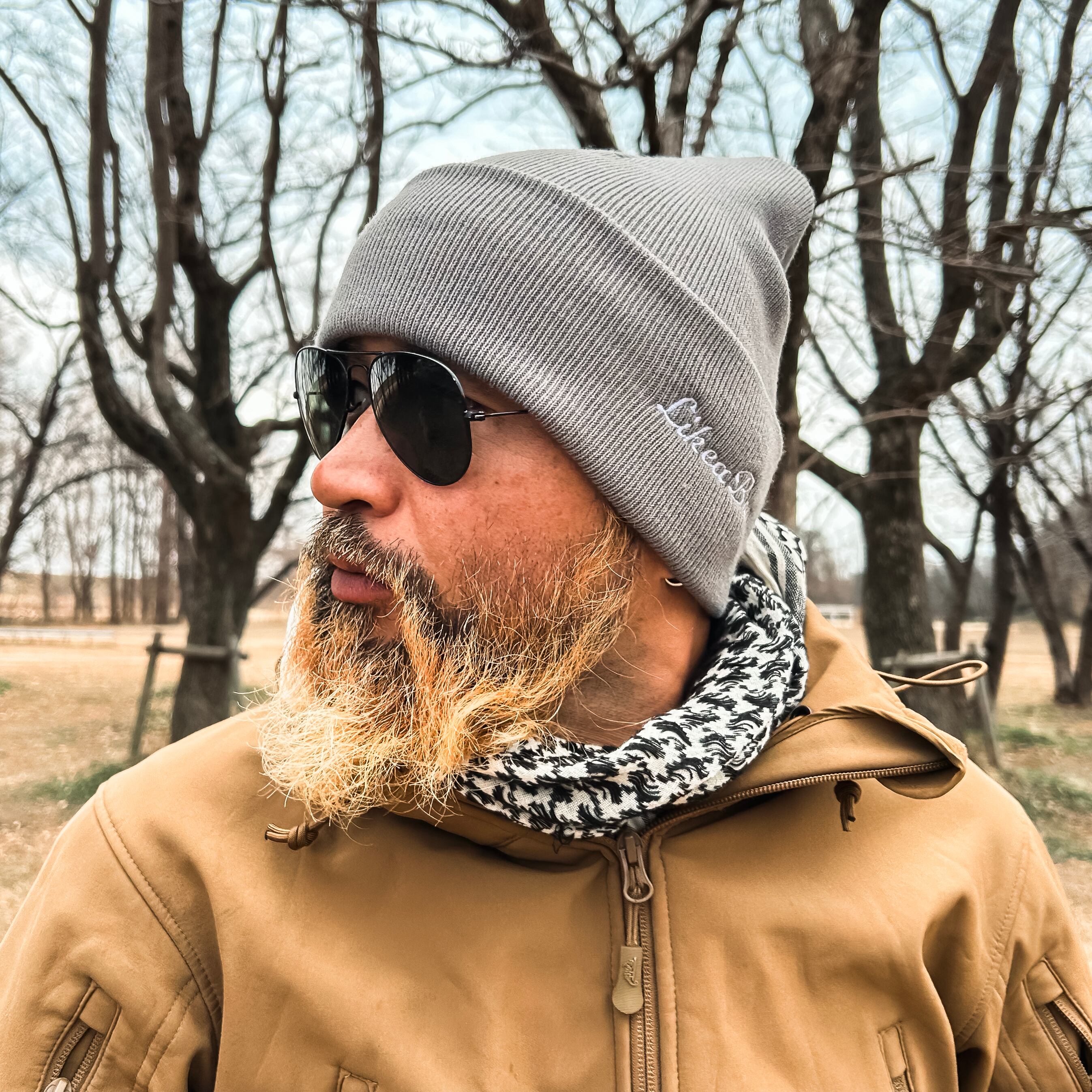 向かって左面にRed Tag、右面にLikeaBoy刺繍が大きく入っています。細かいゲージのリブ編みで保温性も高く、折り返しによりお好みの長さに調整できます。