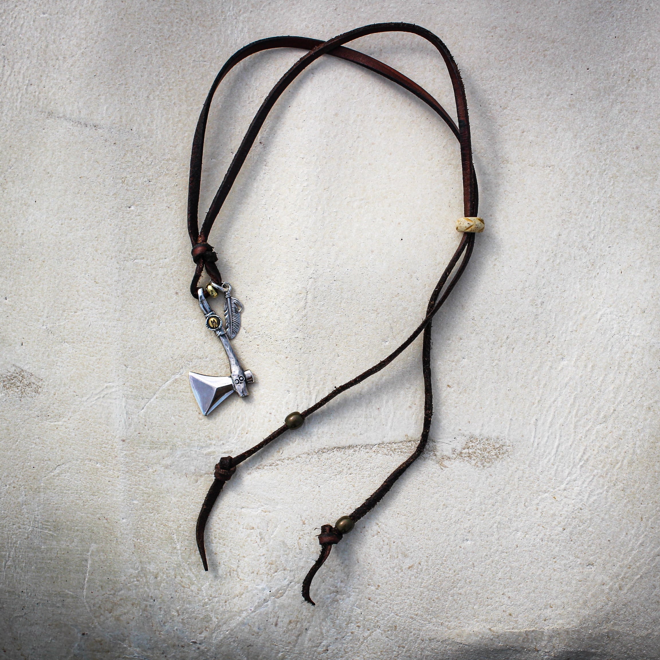 首にかける部分は革紐になっており、アンティークビーズで長さを自由に調整可能。