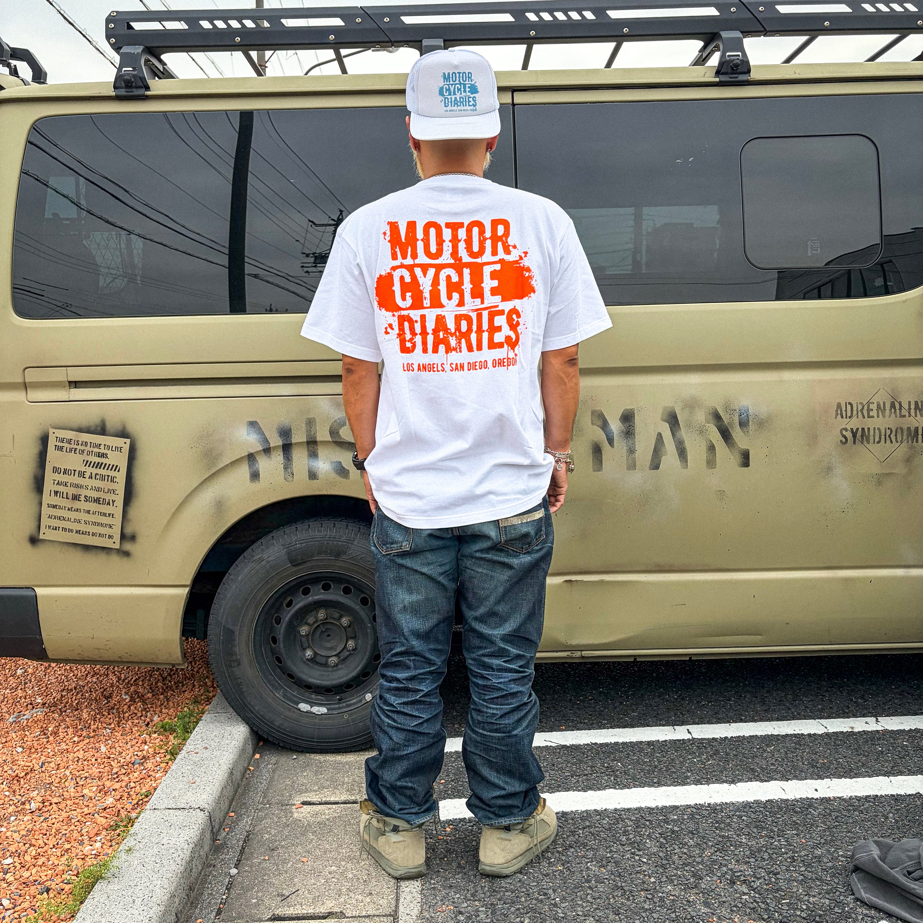 そのイメージを元に、ジョジDがデザインしたのがこのMOTORCYCLE DIARIESの新しい「スーサイド」ロゴ。右袖に縫い付けたRed Tag【DEP.2019】がさりげないアクセントに。